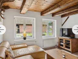 Ebenfalls im Erdgeschoss erwarten Sie eine große, voll ausgestattete Küche sowie ein stilvoll eingerichtetes Wohnzimmer mit Fernseher und gemütlichem Kamin. Die Unterkunft bietet Platz für bis zu acht Personen und eignet sich somit perfekt für Familien oder Gruppen.