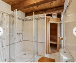 Die großzügige Wohnung verfügt über zwei komfortable Badezimmer: Im Erdgeschoss befindet sich ein modernes Bad mit Dusche, Sauna sowie direktem Zugang zur hinteren Terrasse. Das zweite Badezimmer liegt im Obergeschoss, in unmittelbarer Nähe der Schlafzimmer, und ist mit einer Badewanne ausgestattet.